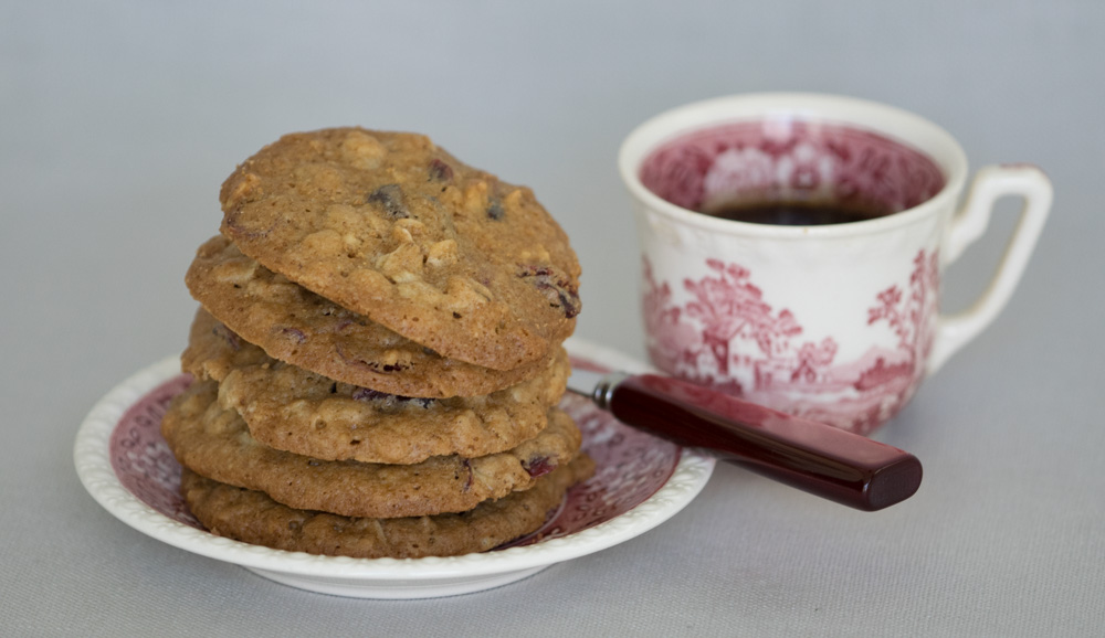 There is nothing better than a cookie, and to me this one is exceptional.  This recipe was made by my dear friend and neighbor Cindy.  She is my first friend to choose a recipe for Mead Meadow, bake it, and deliver warm beautiful cookies for the photo shoot.  It has been adapted from a vintage cookbook, the Boston Cooking School Cookbook by Fannie Merritt Farmer.  The recipe is one of her family favorites and was made by her Mother, Grandmother and Aunts.  She used butter instead of lard, craisins instead of raisins, and added vanilla for extra flavor.  They are not the typical oatmeal raisin cookie. They are slightly soft in the middle, with just a touch of cinnamon and crunchy on the outside.  If only I could pass one to you.  This cookie is delicious!