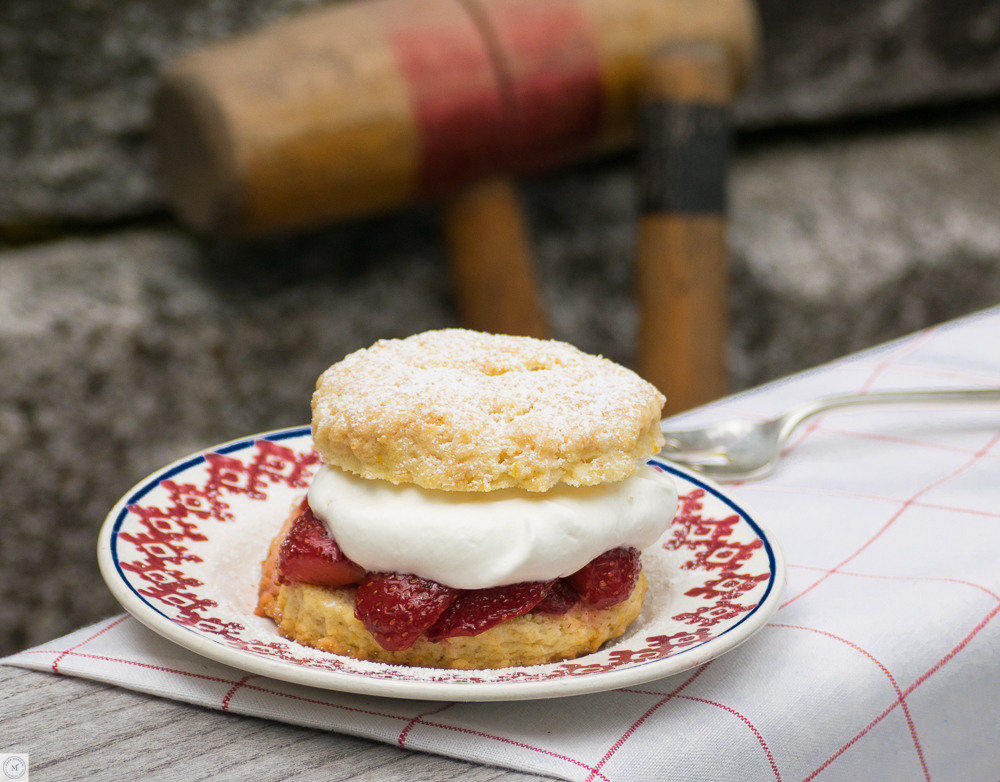 - To prepare the shortcake; In a medium bowl, sift the flour, sugar, baking powder, and salt. Add the orange zest. Add the butter and toss to coat it with the flour mixture. Using a pastry blender, cut the butter into the flour, scraping off the blender as needed, until the mixture resembles coarse bread crumbs with some pea-sized pieces of butter. Using a wooden spoon, stir in the cream and mix just until the dough clumps together.